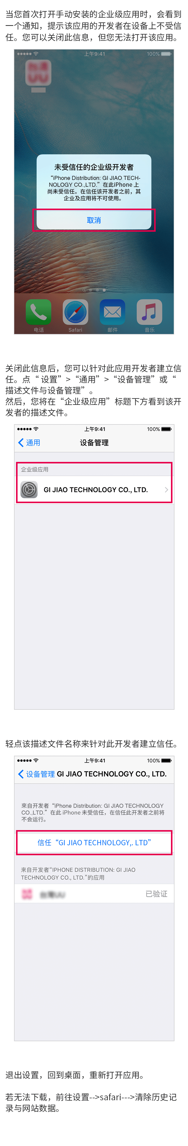 步骤三 设置 > 通用 > 设备管理 / 描述文件与设备管理 > 信任 "GI JIAO TECHNOLOGY,.LTD"